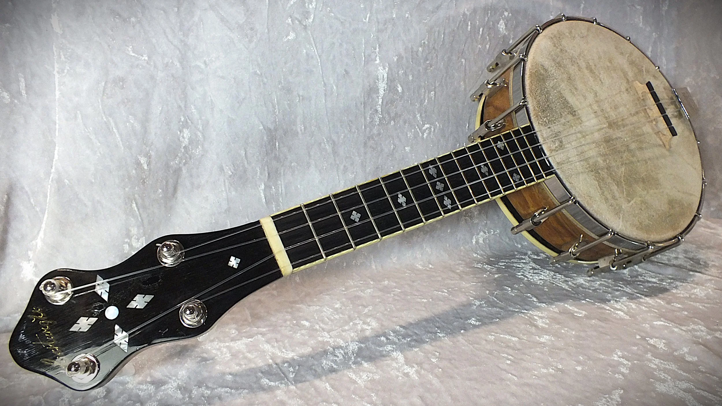 This Cartwright UB2 Banjo Ukulele is a finely crafted homage to the legendary Gibson UB-2. Built with attention to traditional aesthetics and tonal quality, it features a rich walnut resonator, bound ebony fingerboard with mother-of-pearl diamond inlays, and a calfskin vellum for authentic resonance.